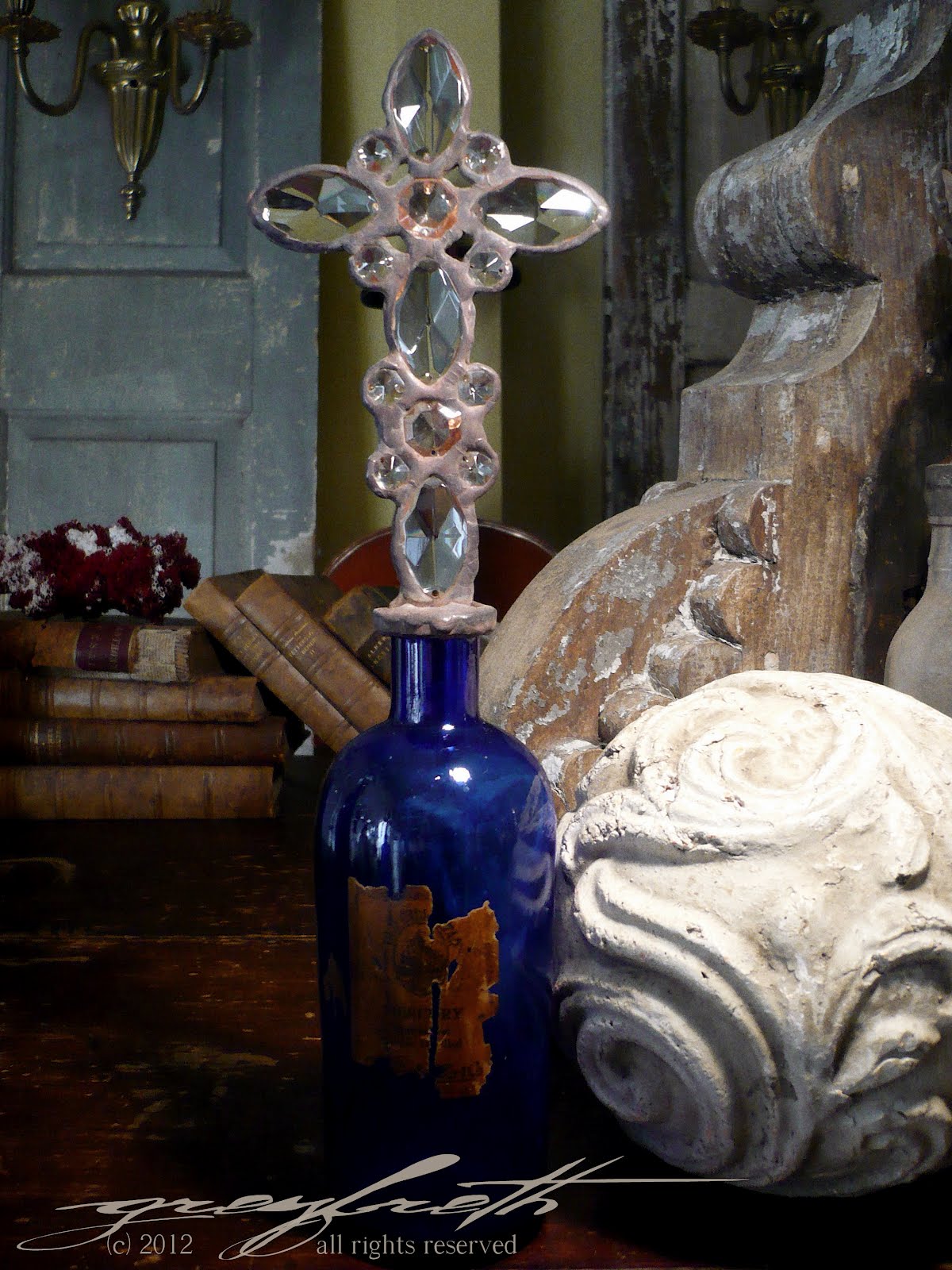 Click on photograph to enlarge image of the cross bottle.Heavily sculpted solder, washed in the worn and rusted hues of weathered iron, frame the plethora of radiant crystals which form the petite French Alisee cross. It is beautifully apparent that the crystals have been cut to catch and refract as much light possible by the confetti of color which is thrown when light washes across the faceted crystal surfaces. The rustic yet refined cross crowns a patinaed bottle of antique cobalt glass that has fabulous bubbles forever held within its walls. A rusty chaplet rosary drapes the shoulder of the bottle and suspended from the rusty chain is a weathered crucifix and aged religious medal. A faintly iridescent, ethereal patina veils the bottles interior -- a testament to the vessel's many years spent buried and hidden away underground.